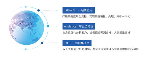AII in BI:一站式應(yīng)用型BI。產(chǎn)品功能全面,打通數(shù)據(jù)應(yīng)用全流程,實(shí)現(xiàn)數(shù)據(jù)填報(bào)、處理、分析一體化。一個(gè)產(chǎn)品平臺(tái)即可為政企用戶(hù)提供從數(shù)據(jù)準(zhǔn)備,ETL數(shù)據(jù)處理、數(shù)據(jù)建模、數(shù)據(jù)可視化、數(shù)據(jù)分析、數(shù)據(jù)填報(bào)、移動(dòng)應(yīng)用等一系列功能。