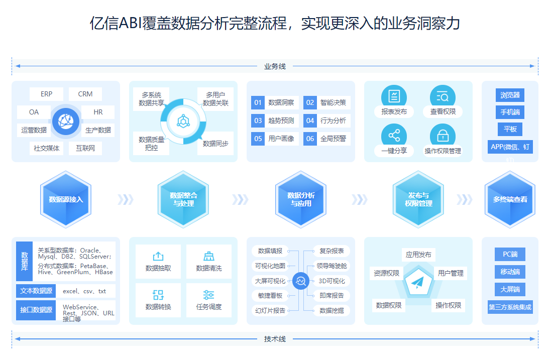 作為一款全能型數(shù)據(jù)分析工具,億信ABI不僅支持連接類似oracle、mysql之類的數(shù)據(jù)庫(kù),還支持類似文件數(shù)據(jù)或者網(wǎng)絡(luò)接口數(shù)據(jù),數(shù)據(jù)來源支持廣泛;億信ABI的分析方式也很豐富,可以滿足市場(chǎng)上的各種場(chǎng)景需求,不論是中國(guó)式復(fù)雜報(bào)表,還是類似天貓雙十一作戰(zhàn)大屏的交互式炫酷效果,它都能實(shí)現(xiàn);億信ABI系統(tǒng)的擴(kuò)展性和穩(wěn)定性都很OK,對(duì)于大數(shù)據(jù)量的數(shù)據(jù)分析,實(shí)現(xiàn)系統(tǒng)的線性擴(kuò)展的同時(shí)保證良好的系統(tǒng)穩(wěn)定性;大數(shù)據(jù)時(shí)代,對(duì)數(shù)據(jù)處理的能力要求也變的更高,億信ABI就實(shí)現(xiàn)了千萬、千億甚至更大數(shù)據(jù)量數(shù)據(jù)的秒級(jí)響應(yīng)。