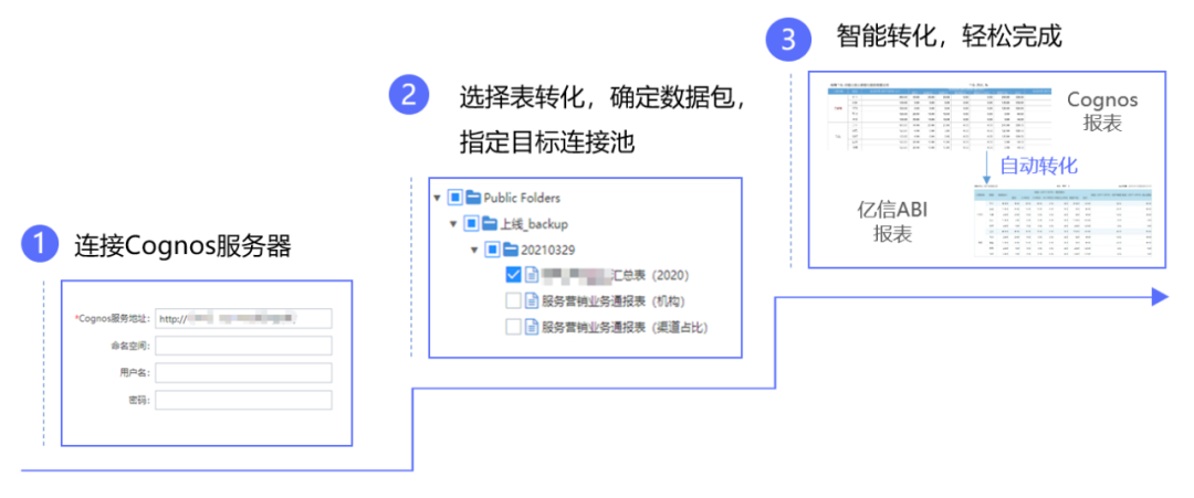為解決重復做表與建模問題,通過億信華辰獨家技術(shù)實現(xiàn)Cognos報表的批量轉(zhuǎn)換、自動轉(zhuǎn)換,只需三步完成Cognos報表到億信ABI報表的轉(zhuǎn)換,全程只需幾分鐘。
