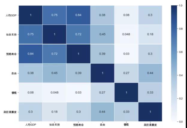 東南亞各國(guó)除了新加坡外的幸福指數(shù)排名處于世界中游。雖然并不理想,但相比于中國(guó)還是略高的。新加坡、泰國(guó)、菲律賓、馬來(lái)西亞、印度尼西亞的世界排名分別為:34,52,69,80,92。 中、東歐的總體水平雖然不如其近鄰西歐,但是依然處于世界前列。這份報(bào)告中東歐包含了部分中亞國(guó)家的成員國(guó),這里所謂的東歐指實(shí)際上的中亞部分國(guó)家。車臣、斯洛伐克、波蘭、烏茲別克斯坦、立陶宛的世界排名分別是:20,38,40,41,42。 國(guó)外的報(bào)告熱衷于將臺(tái)灣和香港單列出來(lái),這份報(bào)告也不例外。東亞國(guó)家和地區(qū)屈指可數(shù),而我國(guó)卻不能居前五,只能說(shuō)明我們?nèi)孕枧ΑE_(tái)灣、韓國(guó)、日本、香港和蒙古的全球排名分別為:25,54,56,78,83。 南亞諸國(guó)一直以來(lái)都是第三世界國(guó)家,其幸福指數(shù)也確實(shí)不夠理想。巴基斯坦、不丹、尼泊爾、孟加拉國(guó)、斯里蘭卡的全球排名分別是:67,95,100,125,130。 撒哈拉以南的非洲各國(guó)經(jīng)濟(jì)落后,社會(huì)發(fā)展程度不高。毛里求斯、尼日利亞、喀麥隆、加納、科特迪瓦全球排名為:57,85,96,98,99。 我們發(fā)現(xiàn)幸福指數(shù)很高的這些國(guó)家都為發(fā)達(dá)國(guó)家,有可能是因?yàn)檫@些國(guó)家的人口基數(shù)少,發(fā)展精工業(yè),社會(huì)制度以及良好的醫(yī)療保障等等因素。而一些發(fā)展中國(guó)家,例如中國(guó),印度等國(guó)家處于中游水平,而幸福指數(shù)最低的幾個(gè)國(guó)家大部分都集中在非洲地區(qū),可能是因?yàn)椋侵薜貐^(qū)的經(jīng)濟(jì)效益不好,戰(zhàn)亂等因素導(dǎo)致的。下面我們研究各個(gè)指標(biāo)對(duì)幸福指數(shù)的影響,看看什么指標(biāo)對(duì)幸福指數(shù)是影響最大的,換句話說(shuō),什么能使人民感到幸福? 我們對(duì)合成幸福指數(shù)所用到的分?jǐn)?shù)進(jìn)行相關(guān)系數(shù)的計(jì)算可以發(fā)現(xiàn),人均GDP與社會(huì)支持和預(yù)期壽命之間具有高相關(guān),相應(yīng)的社會(huì)支持和預(yù)期壽命也存在高相關(guān)。自由與其他因素只有中等程度的相關(guān),而慷慨(捐款)、政府清廉度與其他因素的相關(guān)度都不高。 上述的結(jié)果表明,經(jīng)濟(jì)可能對(duì)預(yù)期壽命和社會(huì)支持都有很強(qiáng)的影響,自由在一定程度上會(huì)影響其他因素,而捐款和政府的清廉程度與其他因素的關(guān)系并不明顯。 由此可推論,發(fā)展經(jīng)濟(jì)是促進(jìn)幸福的硬道理,無(wú)論是預(yù)期壽命還是社會(huì)支持都要有經(jīng)濟(jì)基礎(chǔ)。政府要保持一定程度的清廉才能有利于其他方面的發(fā)展,保證人們的自由也是為幸福提供保障,為其他方面得以發(fā)展的必備條件。 04 中國(guó)幸福指數(shù)分析 我們將中國(guó)在各指標(biāo)上的得分與該指標(biāo)上得分最高的十個(gè)國(guó)家進(jìn)行對(duì)比,分析中國(guó)排名落后的原因。對(duì)人均GDP的分析可以發(fā)現(xiàn),中國(guó)的人均GDP排名全世界第70位,據(jù)此來(lái)看,中國(guó)在發(fā)展中國(guó)家的地位是穩(wěn)穩(wěn)當(dāng)當(dāng)。 我國(guó)的社會(huì)支持在世界排名中為108名。有人說(shuō)如今的中國(guó)社會(huì)人情淡漠,缺乏人與人之間缺乏互助精神,這可能是由于我國(guó)人口眾多,資源有限,競(jìng)爭(zhēng)激烈造成的。人們都在忙于為自己的生活奔波,沒(méi)有時(shí)間去顧及別人。一帶一路在世界范圍內(nèi)交朋友,我們是不是該先想想,怎么和身邊的人交朋友呢? 我國(guó)的預(yù)期壽命排名世界第37,可以說(shuō)是很了不起的成績(jī)了。試想發(fā)展中國(guó)家這么多,我們卻能在預(yù)期壽命上處于世界前列。說(shuō)明我國(guó)在醫(yī)療領(lǐng)域和民生領(lǐng)域的建設(shè)上發(fā)展迅速。 我國(guó)的自由指標(biāo)的世界排名為32,可以說(shuō)即使我們有看不見(jiàn)的墻,有諸多言論方面的管控,可是我們已經(jīng)享有了很高程度的自由。自由對(duì)營(yíng)商的重要性不必多言,市場(chǎng)經(jīng)濟(jì)能高效運(yùn)轉(zhuǎn),自由是前提。 我國(guó)的捐款指標(biāo)的世界排名僅為147,這一點(diǎn)可能是拖累我國(guó)幸福指數(shù)的最大原因。我們的公益事業(yè)發(fā)展?fàn)顩r很不好,沒(méi)有形成規(guī)模較大且靠譜的公益組織,相關(guān)的人才隊(duì)伍也沒(méi)建設(shè)起來(lái),民眾的捐款意識(shí)也不強(qiáng)??赡艿脑蚧蛟S是政府包辦了許多工作,更可能與我國(guó)沒(méi)有做公益的文化有關(guān)。希望未來(lái)這一情況得以改善,讓社會(huì)充滿愛(ài)。 我國(guó)的政府清廉度排名為59,這說(shuō)明近幾年中央主持的反腐工作還是比較到位的,同時(shí)也說(shuō)明,我國(guó)過(guò)去的腐敗情況確實(shí)堪憂。 對(duì)過(guò)去五年的中國(guó)在各指數(shù)上的全球排名的變化可以發(fā)現(xiàn),預(yù)期壽命基本保持不變,人均GDP緩步上升,政府清廉度急速上升,捐款狀況在低位徘徊,人民自由先降后升??梢苑从吵觯覈?guó)的反腐斗爭(zhēng)成績(jī)喜人,經(jīng)濟(jì)建設(shè)還需努力,民生醫(yī)療建設(shè)成果要繼續(xù)保持,為了更好的發(fā)展,我們需要更高質(zhì)量的自由。 為什么