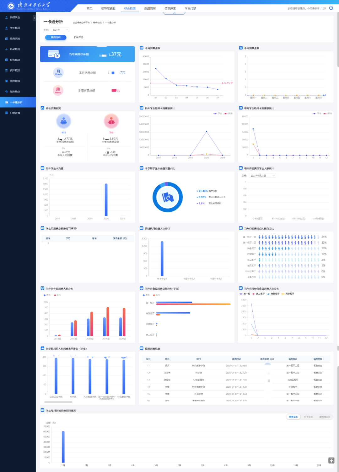 豐富的校情可視化數據看板 在綜合校情查詢與主題分析角度,對教務教學、科研、資產、財務、人事與學生管理、一卡通等業務,進行結構、趨勢、分布等綜合分析,讓各級領導一屏在手,掌握全局,多種指標實時隨地呈現,助力科學決策。 師資隊伍 高校師資隊伍建設的優劣決定了高校人才培養質量的高低。如何在大數據時代科學利用源于高校各個層面的海量數據,并使之成為高校師資隊伍建設的參考與方向,是眾多高校需要解決的問題。師資隊伍頁面通過展現教職工主要的屬性指標,分析了目前高校師資隊伍建設中所存在的問題,對加強高校師資隊伍建設起到指導作用。如下圖: 學生概括 學生概括展現出學生的基本屬性、人數分布、學籍情況、借閱與消費、畢業與就業等指標。如下圖: 資產分析 強化資產管理是推進預算制度改革的重要內容,也是部門預算有效執行的重要保證。資產概括頁面通過分析學校各類型資產的存量和分布情況,可以提高資產的利用率,從而指導探索進一步管好用好高校資產的方法與途徑。如下圖: 圖書借閱 對陜西中醫藥大學圖書館館藏圖書的種數、冊數,以及圖書借閱率,不同用戶群借閱情況進行了統計,通過對統計數據的分析找出了圖書流通的一般規律,為今后館藏資源的配置、布局以及流通閱覽服務工作的完善提供參考。如下圖: 一卡通分析 一卡通分析頁面通過對全校師生消費和卡片進行分析,可以讓學校管理者對在校師生的消費情況和規律有一個量化的認識,從而能夠合理地分配資源,降低管理成本,這對校園的規劃建設和學校學生管理工作都具有重要的作用。如下圖: 多層級的權限管理 億信ABI搭建的校情綜合分析平臺,系統主要分五種類型用戶:學校領導、行政部門領導、教學部門領導、行政部門老師和教學部門老師。用戶根據不同的角色具有不同的權限 ,看到的信息也不同。