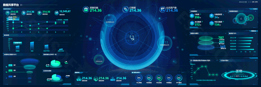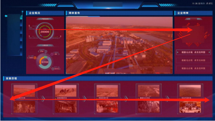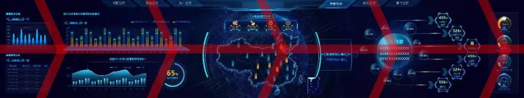 再者,設計人員需要明確大屏的視覺路線即展示路線,這條線能講出怎樣的故事跟你的布局構圖密切相關。下面提供幾種常見的構圖思路,希望對大家有所啟發和幫助。 1、中心放射型 以中間核心內容向周圍放射,正中多以地圖和給人視覺沖擊的主視覺為主,起到聚焦凸顯的作用,層次明晰,主次分明。